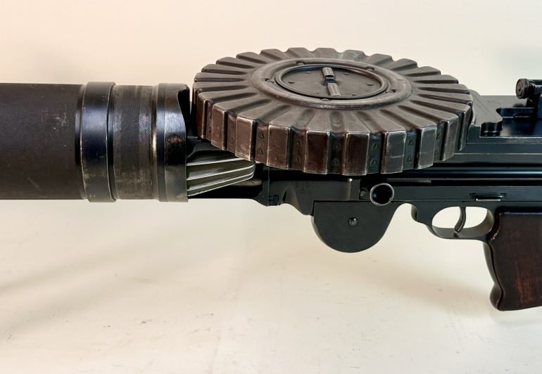 Reference Chapter 12 “The Belgian Rattlesnake” by my old friend Bill Easterly. This firearm is more than unique; it is part of the original Twentieth Century Fox Studios ordnance collection. Purchased in the mid 1970’s, by Dolf Goldsmith and his business partner Burt Jakes. By word of mouth only, this is one of the two Lewis Guns used in the movie “Sand Pebbles” with Steve McQueen. The gun has all original Savage parts to include .303 Savage drum. Overall condition is excellent plus. It is test fired and ready to go.